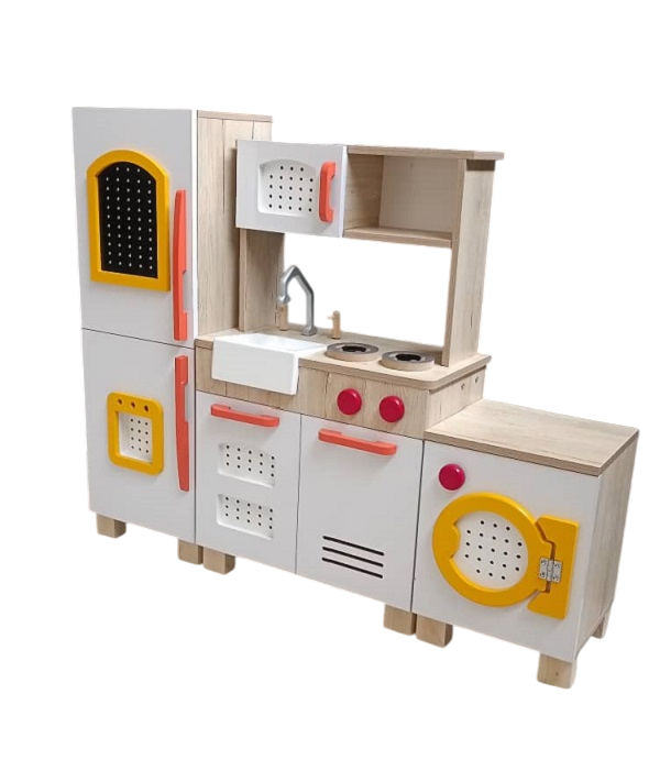 اسباب بازی چوبی آشپزخانه شامل مایکروفر , گاز دو شعله , ماشین لباسشویی با ولوم های چرخشی , یخچال با طرح آبسردکن روی درب , سینک ظرفشویی ,1 درب کابینت و فر دو طبقه برای قرار دادن وسایل آشپزخانه.