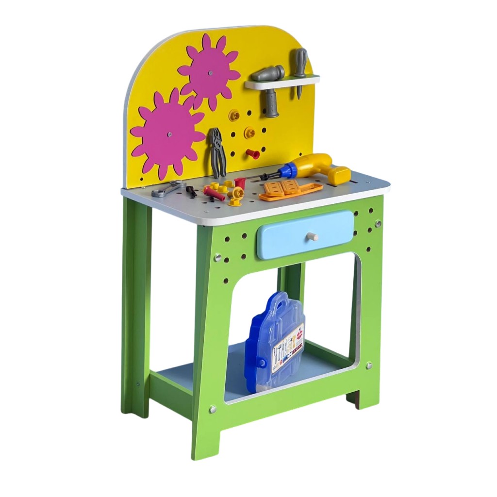 میز ابزار کودک یک میز خلاقیت میباشد تا کودک با ابزار و نحوه ی کار آنها آشنا شود و بازی کند. میز ابزار دارای ارتفاع 90 سانتیمتر بوده و دارای چرخنده های چرخان و پک پیچ و مهره های باز و بسته شو با آچار و پیچ گوشتی است.